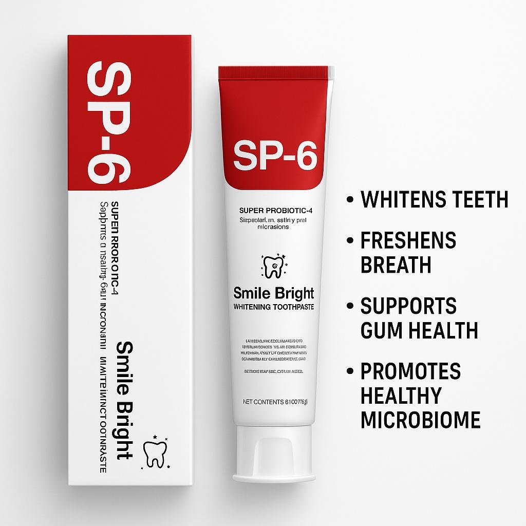 Unlike conventional toothpaste that can strip away good bacteria, SP-6 Probiotic Toothpaste works with your body’s natural defenses to maintain optimal pH levels and fight harmful bacteria—helping to prevent cavities, sensitivity, and gum inflammation. Infused with gentle whitening agents, it removes surface stains for a naturally brighter smile while remaining safe for daily use.